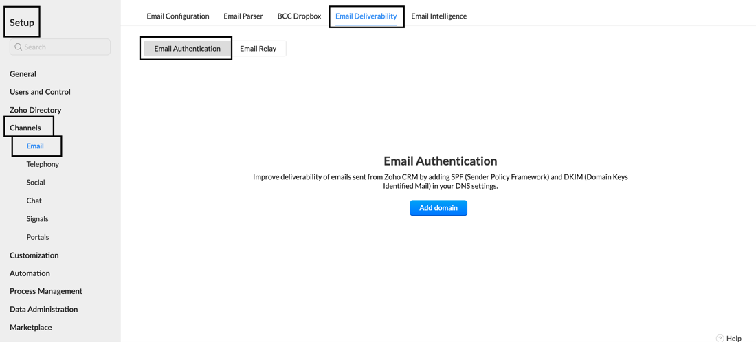 Zoho CRM provides email authentication standards that allow organizations to increase the trustworthiness of an email's origin when they choose to send emails from Zoho CRM using their domain.